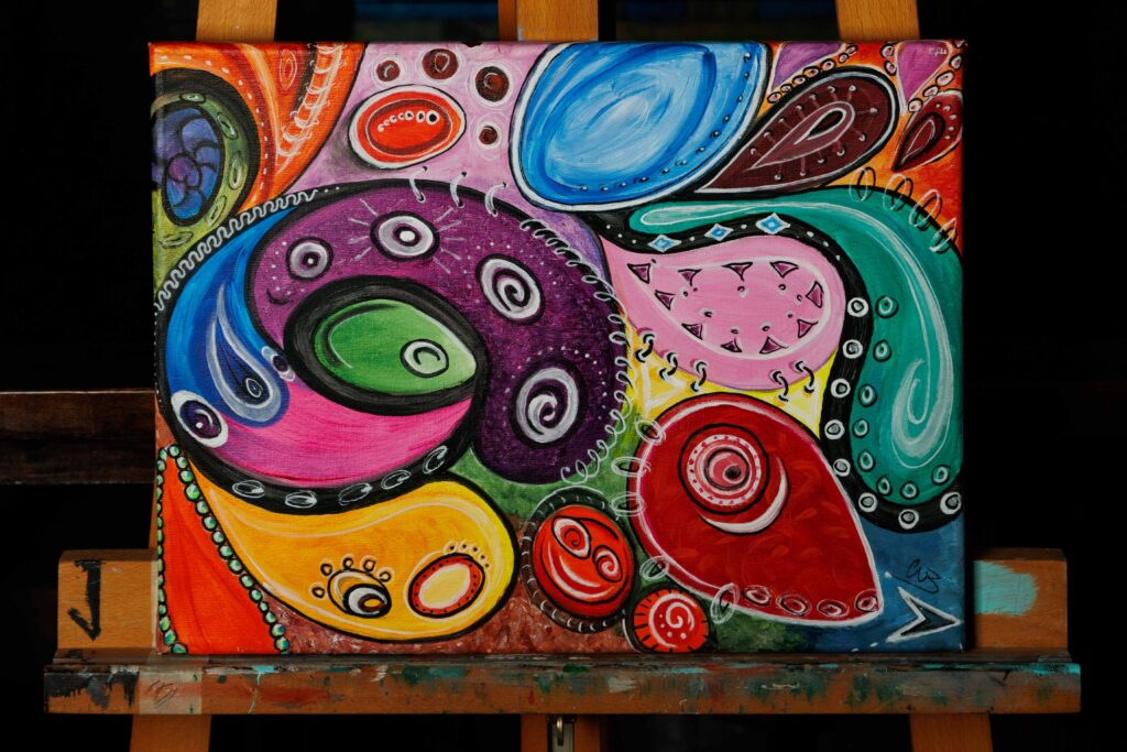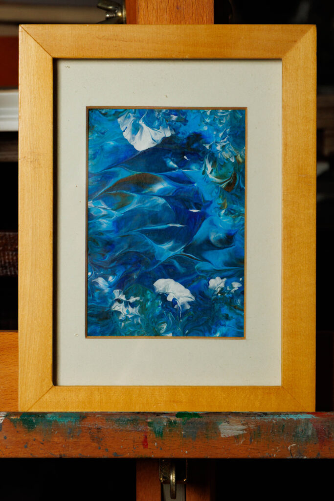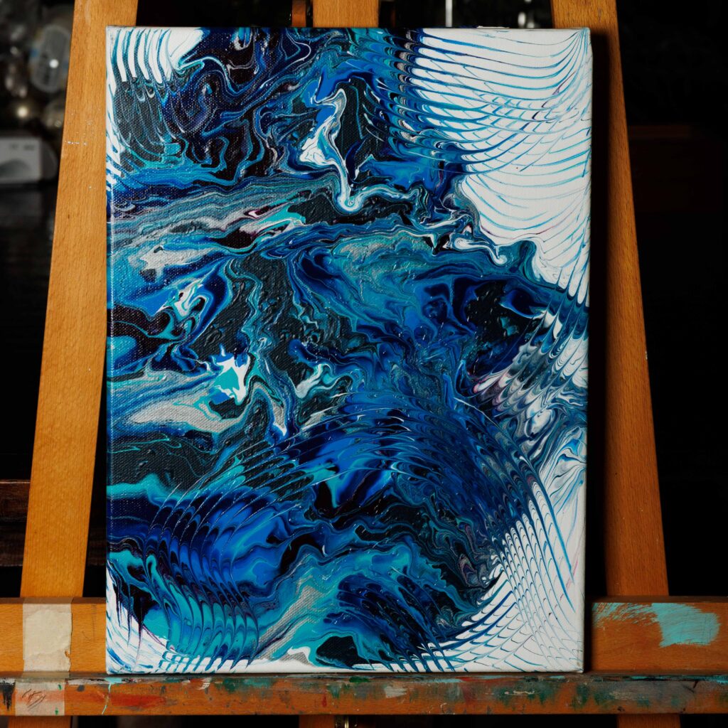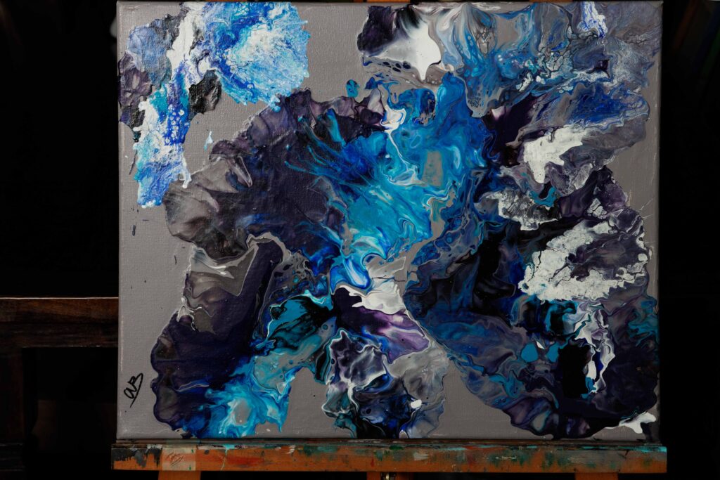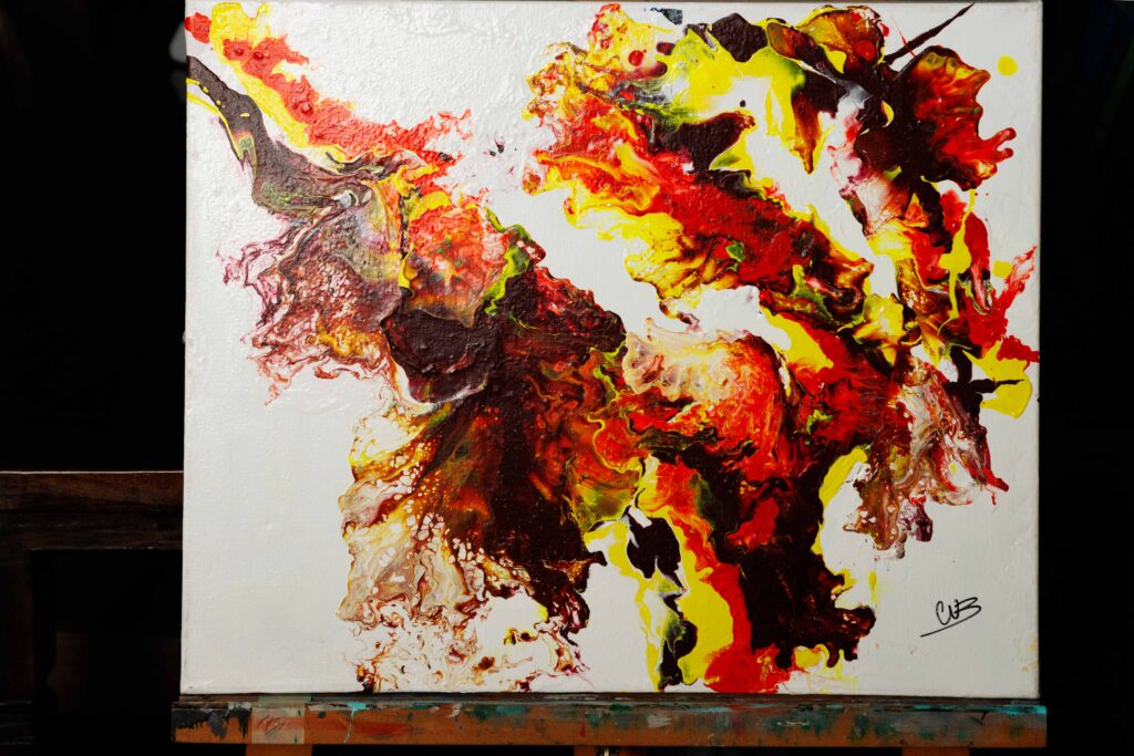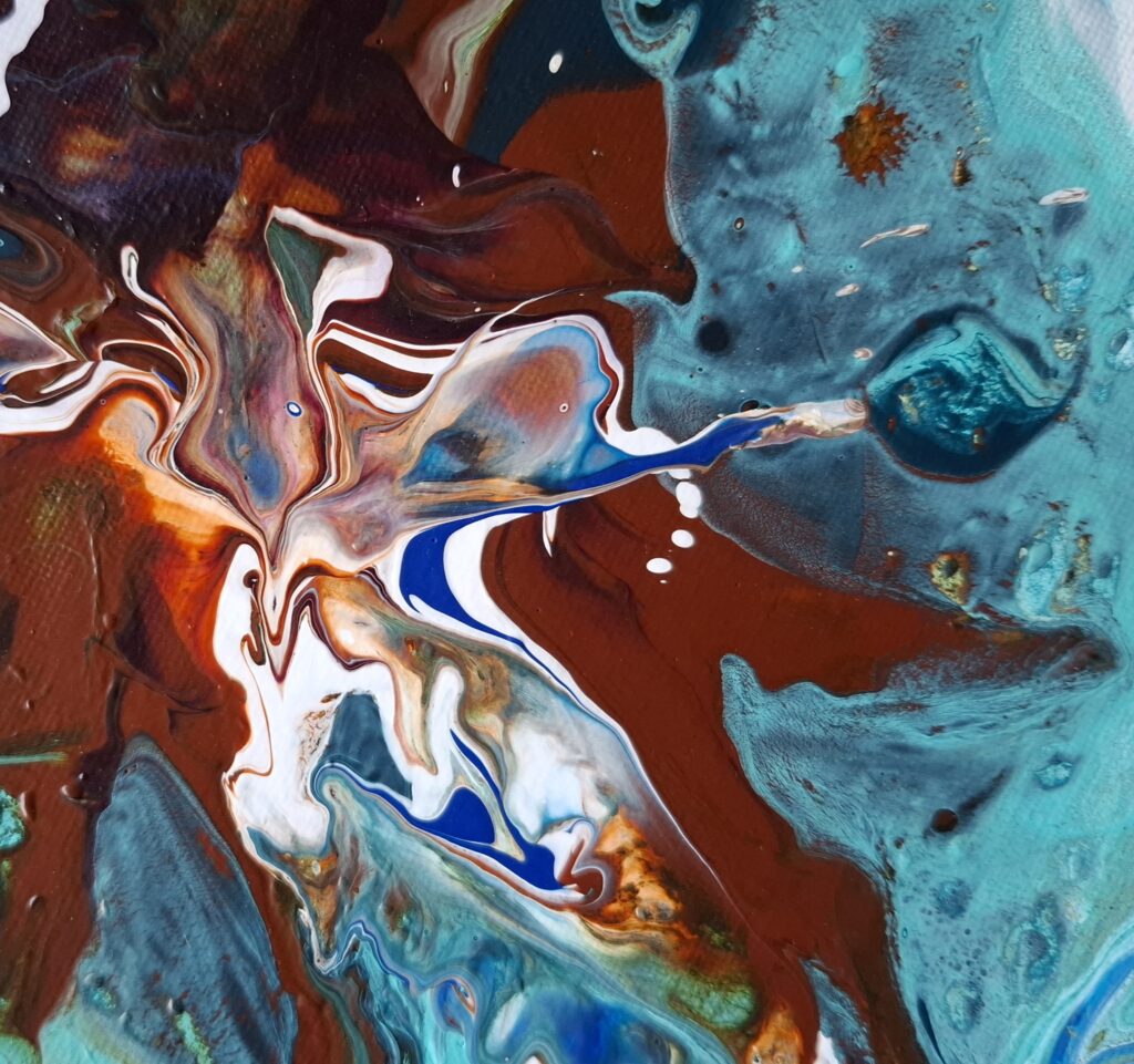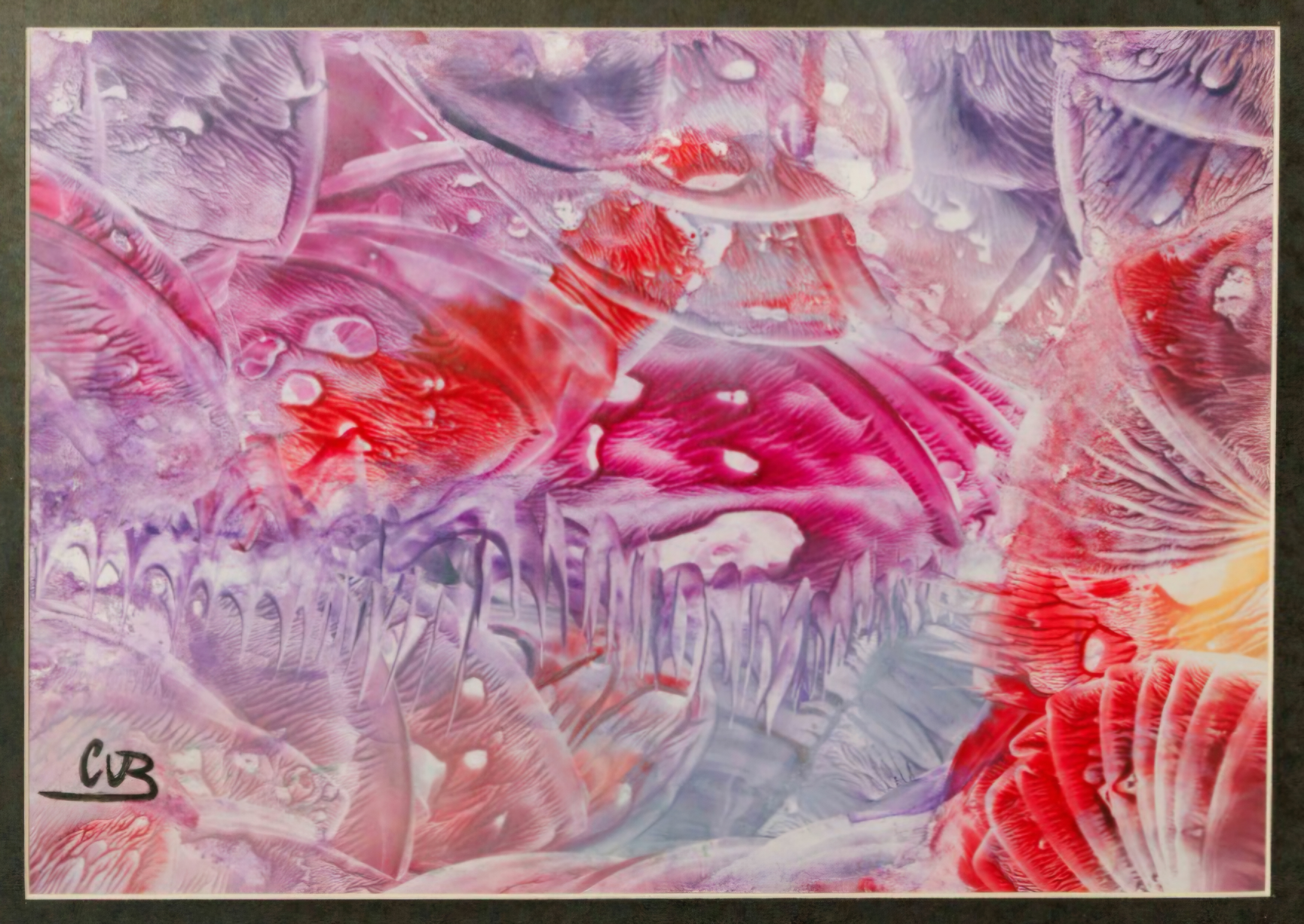 Een van de manieren waarop ik abstracte werken heb gemaakt is d.m.v. acryl-pooring (het op een bepaalde manier gieten van verdunde acrylverf). Daarmee kunnen zeer verrassende effecten ontstaan.